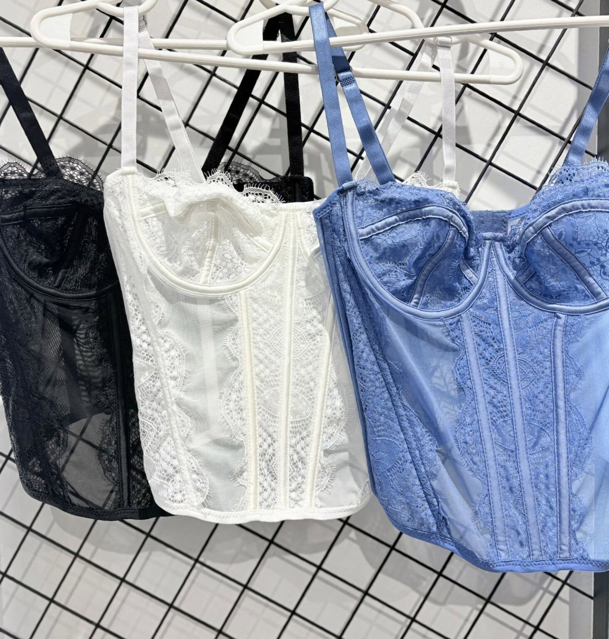 La modelo con el corset negro usa talle 90 y la modelo con el celeste, talle 95 📏​