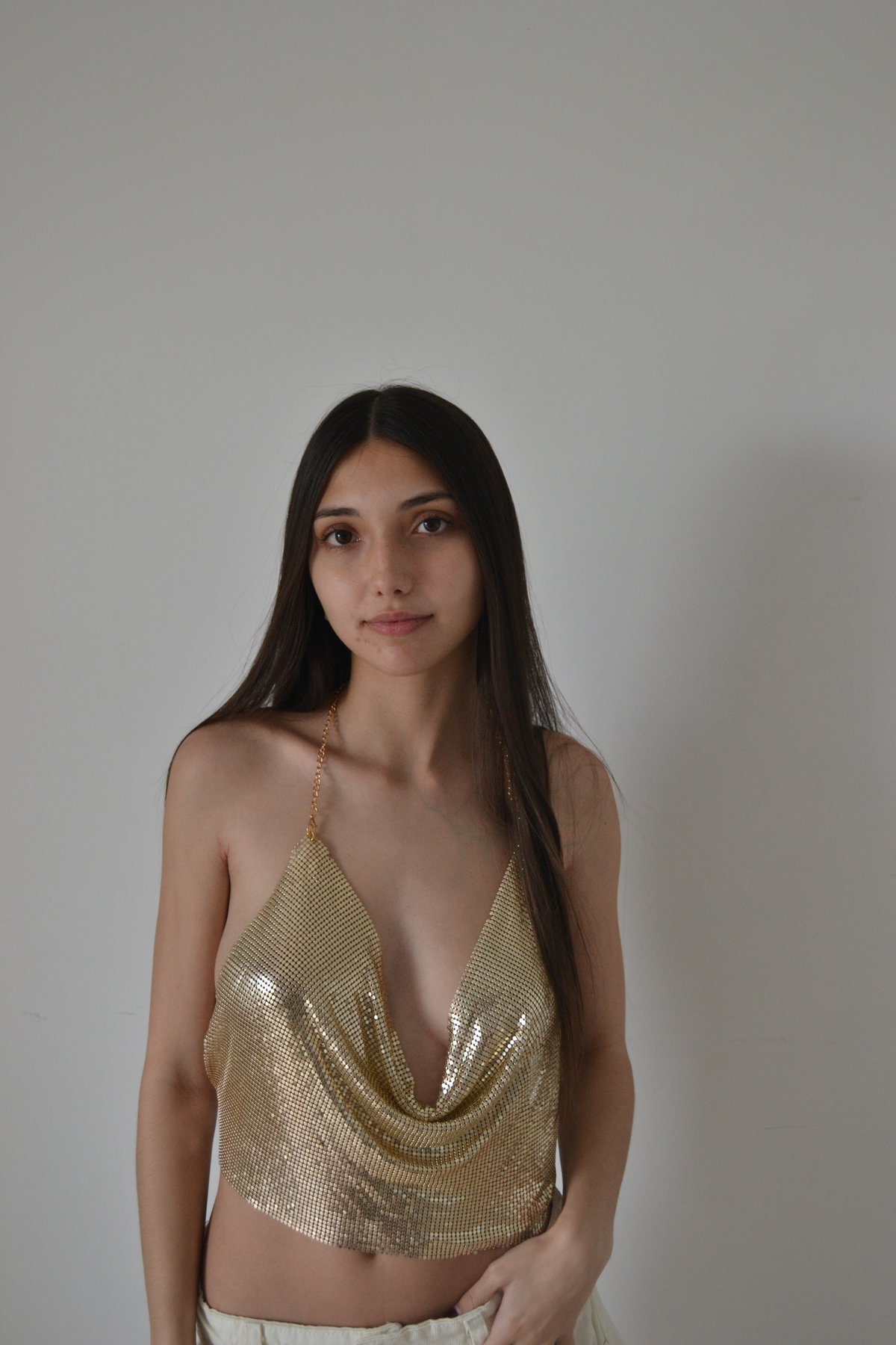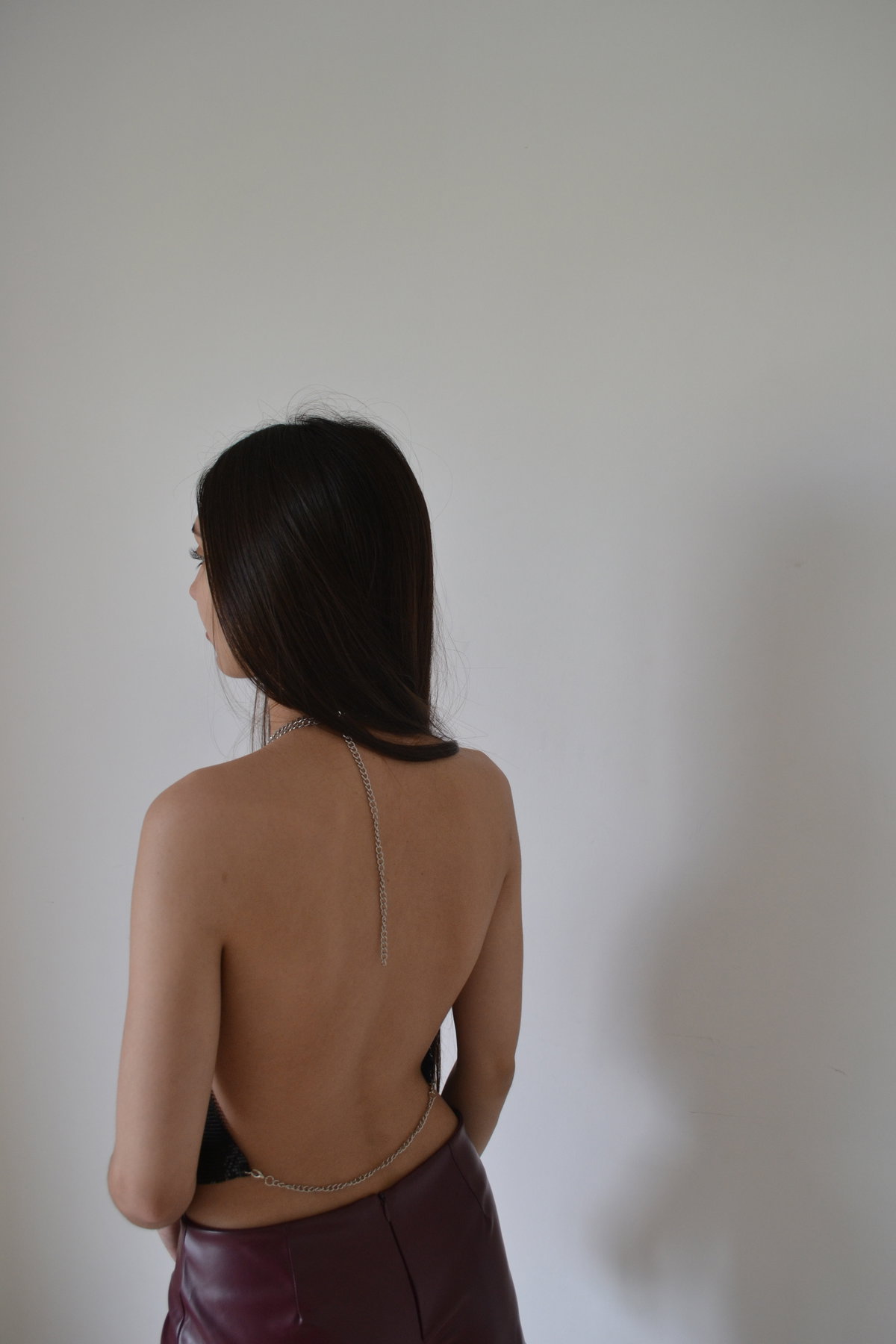 El Top Abril con caída buche, con cadenas, espalda descubierta, aporta ese toque canchero y llamativo que levanta cualquier outfit ✨ Disponible en negro, plateado y dorado. Talle único.